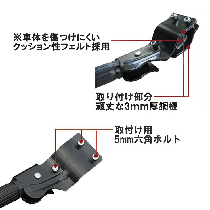ロードバイク・クロスバイクのサイズ700C、マウンテンバイクの26インチ・27インチ等におすすめ! 車体を傷つけにくいクッション性フェルト採用!! 【自転車 サイドスタンド 汎用サイドスタンド】 【素材】スチール・PB樹脂他 【サイズ】380mmx60mmx55mm 【重量】約360g 【必要な取付工具】六角レンチ5mm(サイドスタンドには付属しませんので、ご用意ください) ※輸送・保管時についた小傷や汚れがある事があります。